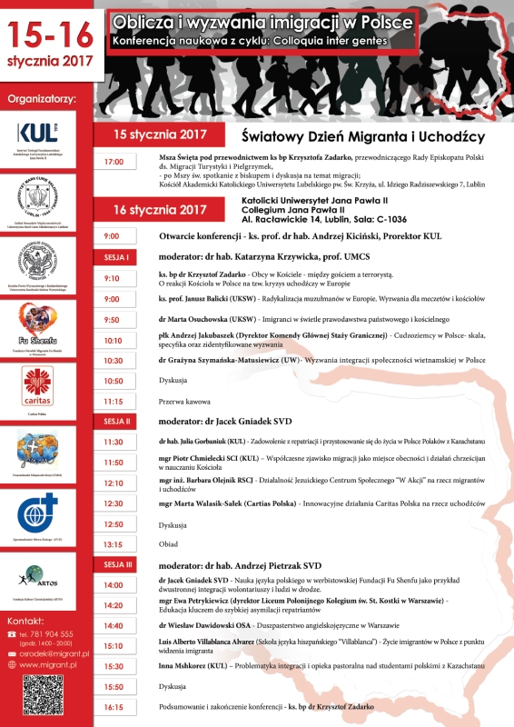 16 stycznia natomiast odbędzie się konferencja naukowa zatytułowana "Oblicza i wyzwania imigracji w Polsce". Wśród licznych prelegentów będzie ks. bp Krzysztof Zadarko, ks. prof. Janusz Balicki, Dyrektor Komendy Głównej Straży Granicznej płk. Andrzej Jakubaszek i dobrze Wam znany ks. Jacek Gniadek, Dyrektor Ośrodka Migranta. Nie zabraknie też spojrzenia z punktu widzenia imigranta.